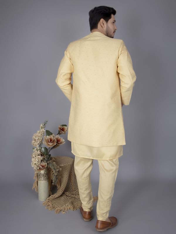 Designed with a Mandarin collar, full sleeves, and mid-thigh length, this outfit ensures a dignified and polished appearance for every special occasion. Whether it’s a festival, family ceremony, engagement, reception, or grand wedding function, this traditional ensemble guarantees style and comfort in every moment.