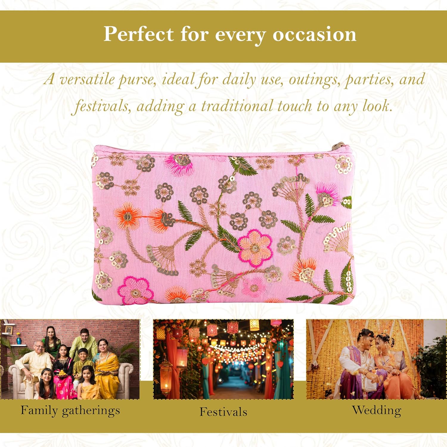 Traditional Embroidered Hand Purse Set for Women – 2 Pcs Floral Zip Pouch | Ethnic Ladies Wallet | Cream & Light Pink