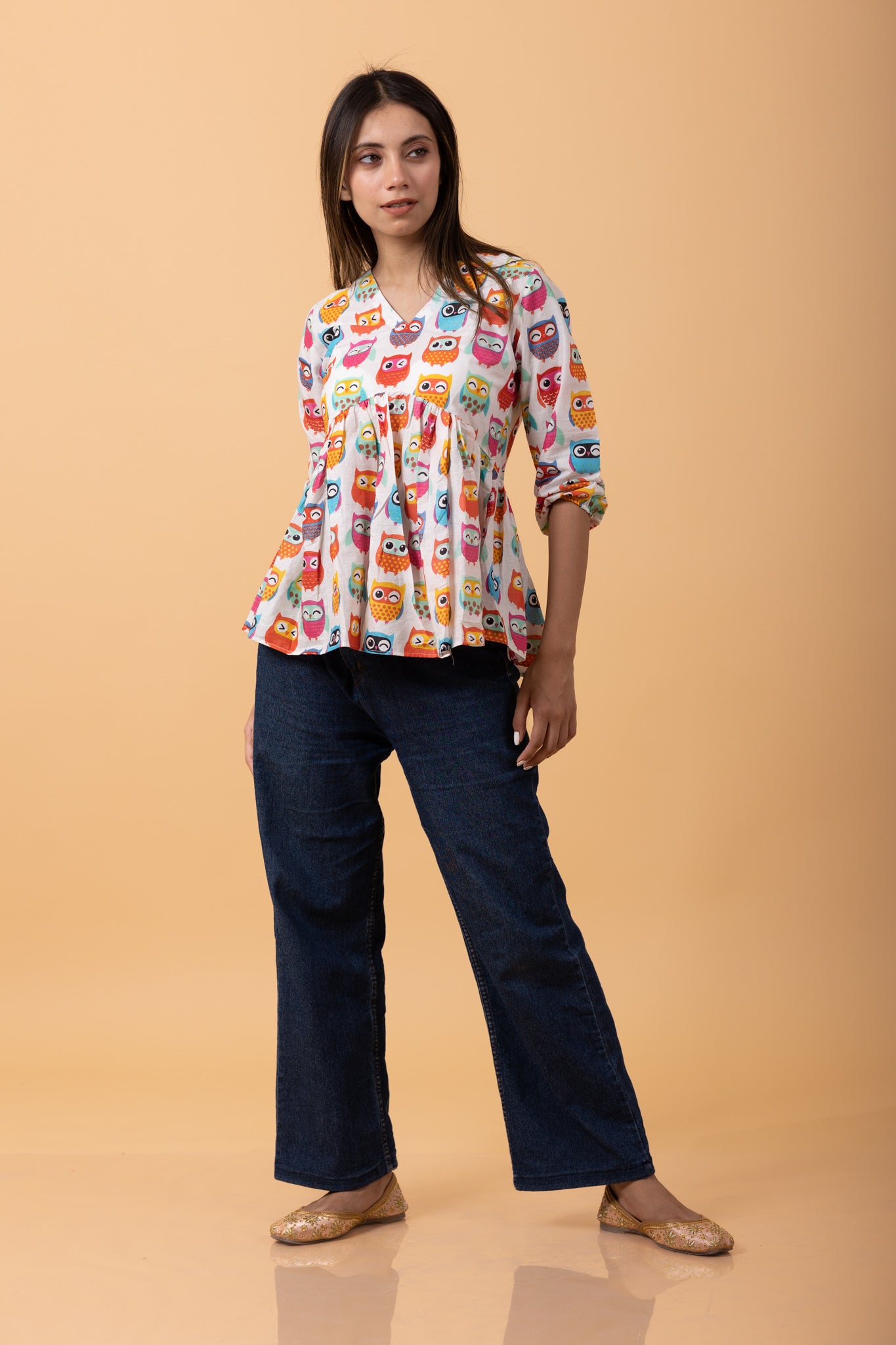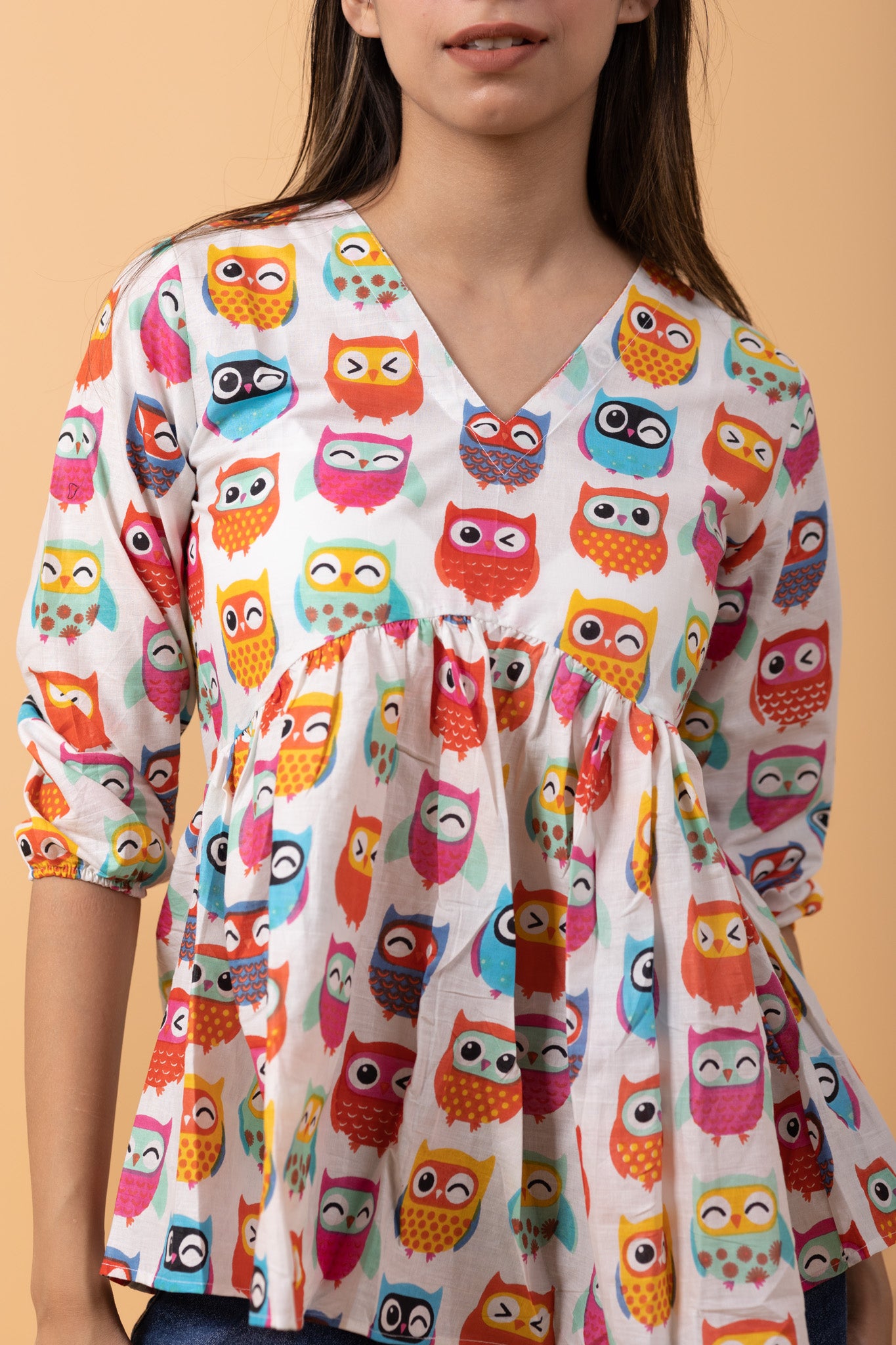 Beat the summer heat in style with this White Owl Printed 100% Cotton Short Kurti, designed for comfort, breathability, and effortless fashion. Perfect to pair with jeans for college, office, or casual outings.