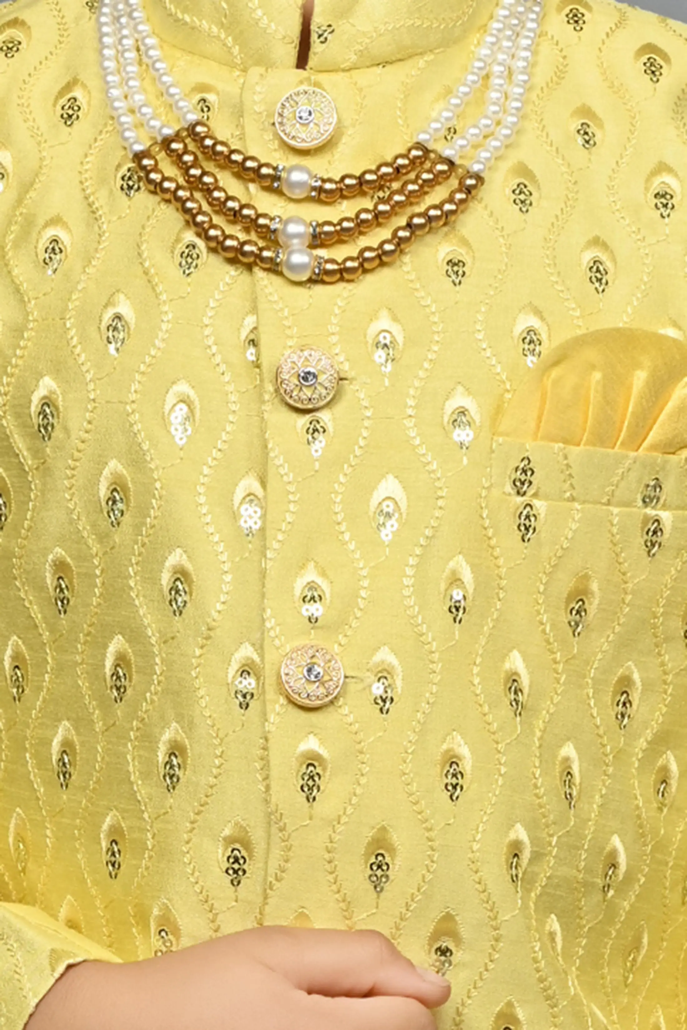 Give your little one a royal ethnic makeover with our Silk Blend Sequin Print Indo-Western Sherwani Set for Boys, thoughtfully designed to elevate festive and wedding attire. Crafted with a luxurious silk-cotton blend, this sherwani set delivers a soft texture, comfortable feel, and long-lasting durability—ideal for all-day celebrations.