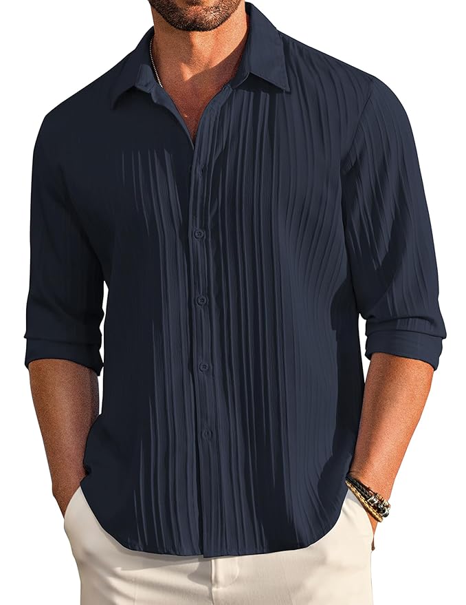 DEELMO Men's Casual Button Down Shirts Long Sleeve Linen Shirt Fashion Textured Beach Summer Shirt