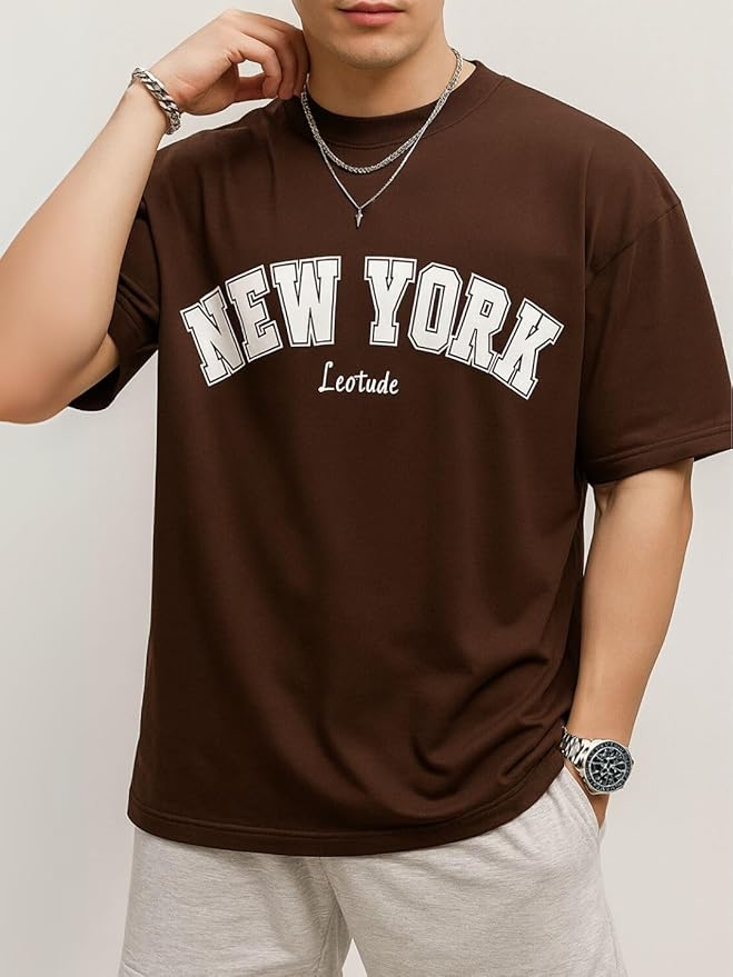 LEOTUDE Casual Half Sleeve Cottonblend Printed Round Neck Drop Shoulder Oversized Tshirt for Man (Color Brown)