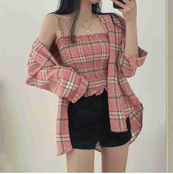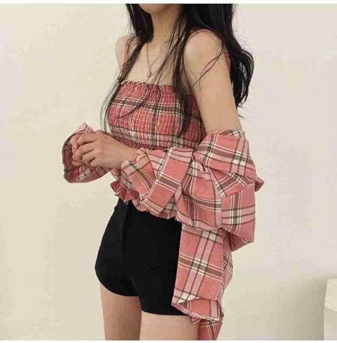 The stylish tube top features elastic smocking for a secure, flattering fit, making it ideal for warm days or layered outfits. The accompanying full-sleeve plaid shirt is crafted with a relaxed silhouette, allowing easy movement and effortless comfort. Wear it open as a light jacket, buttoned up for a smart casual look, or mix and match each piece with different bottoms to expand your wardrobe possibilities.